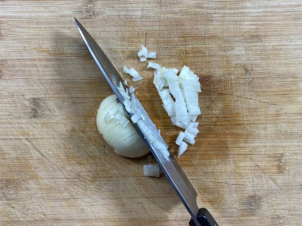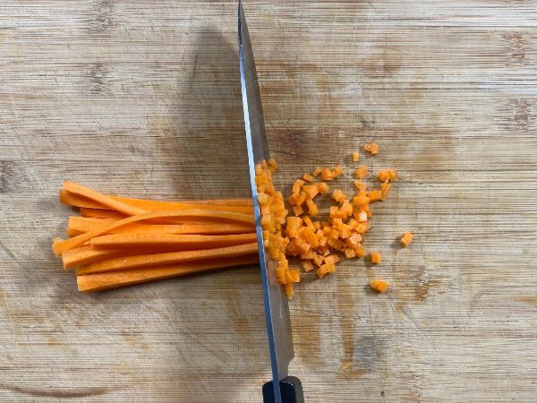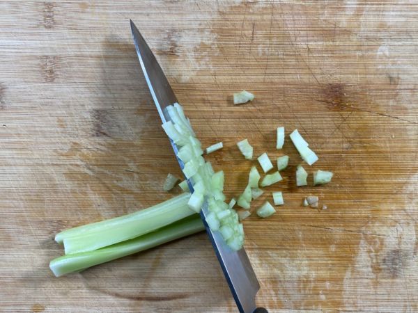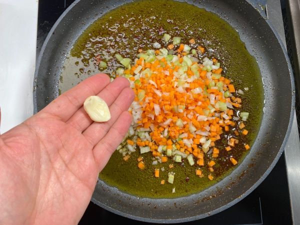 Für die Zubereitung des "Pollo alla Cacciatora/Hähnchens nach Jägerart" bereiten Sie zunächst das Gemüse für die Soffritto-Mischung vor: Schälen und hacken Sie die Karotte 1, putzen und hacken Sie die Zwiebel 2 und machen Sie dasselbe mit dem Sellerie 3.