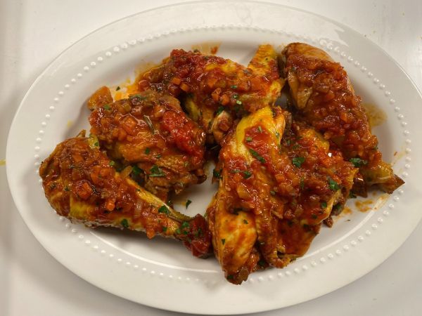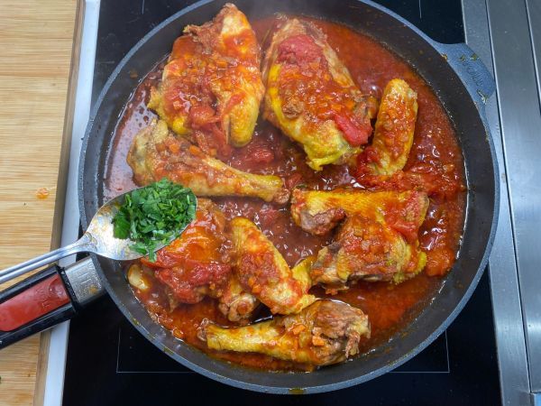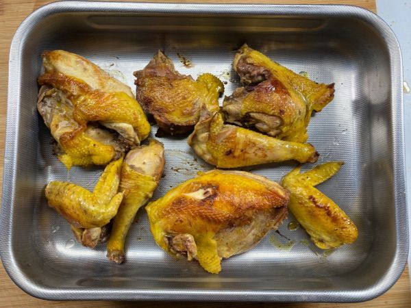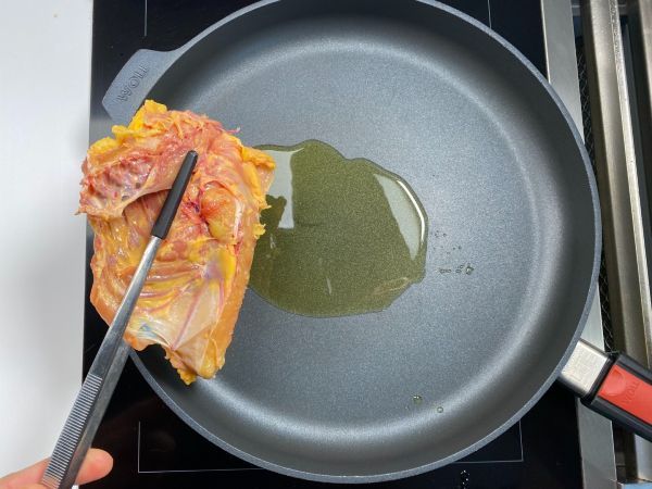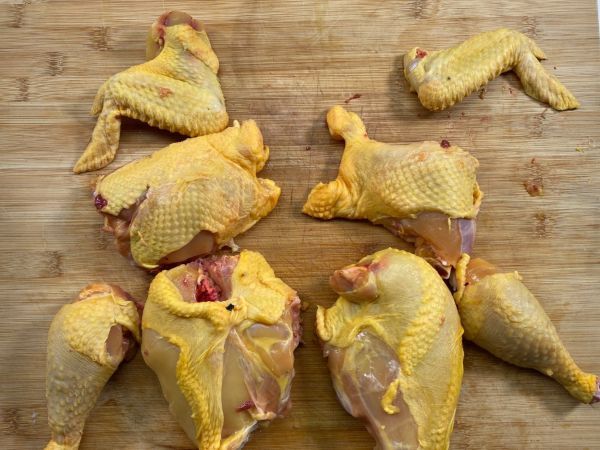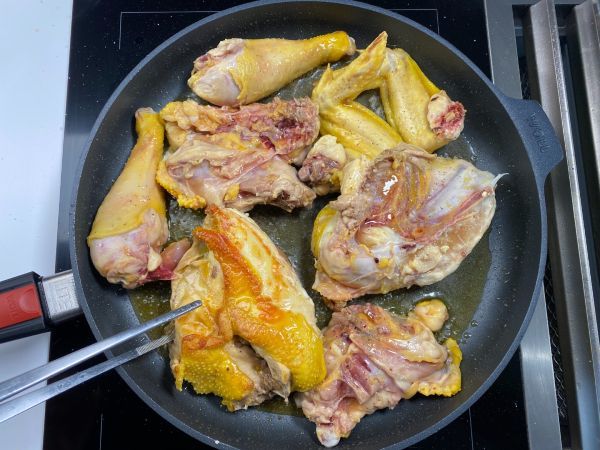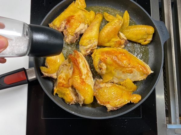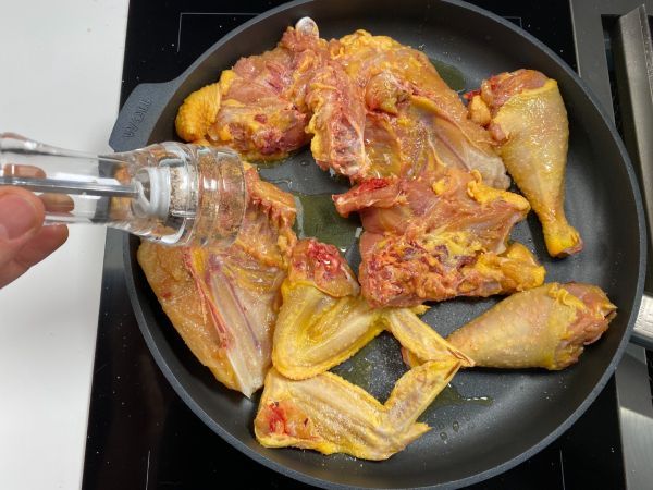 Das Hähnchen in 8 Teile schneiden, sodass Brust, Keulen, Oberschenkel und Flügel getrennt sind 4. Das Öl in eine große, vorgeheizte Pfanne geben und das Hähnchen mit der Hautseite nach unten hineinlegen 5, mit Salz und Pfeffer würzen 6.