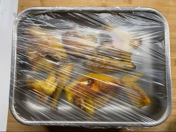 Den Alkohol verdampfen lassen und das Hähnchen in eine Auflaufform geben 10 und mit Frischhaltefolie abdecken 11. In dieselbe Pfanne das gehackte Gemüse und den Knoblauch geben 12.