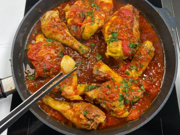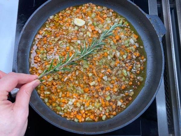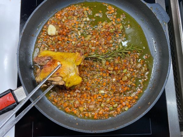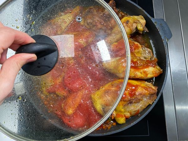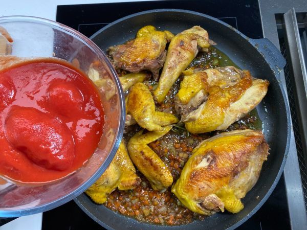 Den Rosmarinzweig hinzufügen 13. Die Hitze etwas reduzieren und etwa 10 Minuten lang schmoren lassen. Das Hähnchen wieder in die Pfanne geben 14 und die geschälten Tomaten hinzufügen 15.