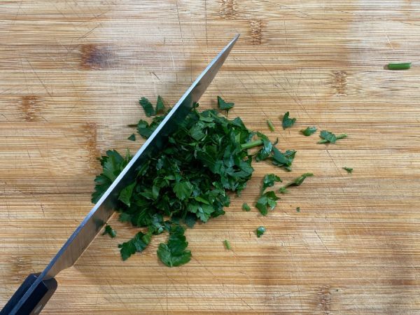 Mit einem Deckel abdecken 16 und 30 Minuten bei schwacher Hitze garen lassen. In der Zwischenzeit die frische Petersilie waschen und mit einem Messer hacken 17. Nach 30 Minuten die Hitze ausschalten und mit Petersilie würzen 18.