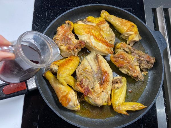 Das Hähnchen bei mittlerer bis hoher Temperatur anbraten, ohne es zu berühren, damit eine schöne Kruste entsteht. Nach etwa 6 Minuten das Hähnchen wenden 7, mit Salz 8 und Pfeffer würzen und auch auf der anderen Seite goldbraun anbraten. Sobald es gut angebraten ist, mit Rotwein ablöschen 9.